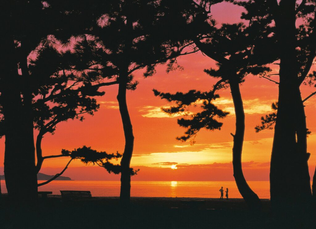 白砂青松の風景に加え、夕暮れ時には水平線に沈む夕日が松林を染める絶景が楽しめることでも知られています。