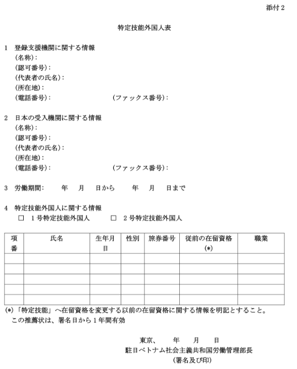 Giấy tiến cử kỹ năng đặc định do đại sứ quán Việt Nam tại Nhật Bản cấp. Các xí nghiệp hoặc cơ quan hỗ trợ đăng ký sẽ có trách nhiệm xin giấy nếu ứng viên đỗ phỏng vấn.