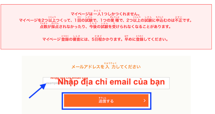 Bước 4: Nhập địa chỉ email vào cột メールアドレスを入力してください sau đó ấn nút 送信 gửi đi, sẽ có thông báo về địa chỉ email của bạn.