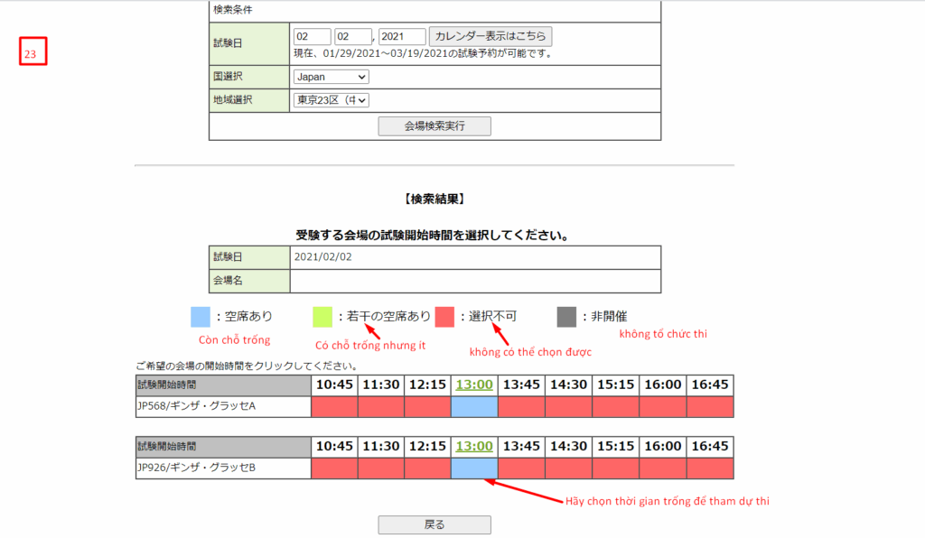 Sau khi thanh toán xong các bạn quay lại bước số ⑬ chọn vào mục 予約の確認(確認書の表示)để in phiếu dự thi. Sau khi thi xong trên màn hình thi sẽ hiển thị kết quả bạn đỗ hay trượt.