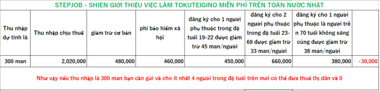 Công thức: Thu nhập chịu thuế – giảm trừ cơ bản (48 man) – trừ đi số tiền bảo hiểm và các khoản khấu trừ khác –  số tiền giảm trừ đăng ký người phụ thuộc tương ứng với số tuổi = 0 hoặc số âm => bạn sẽ biết được cần gửi phụng dưỡng cho bao nhiêu người (công thức này chỉ ra được kết quả mang tính chất tham khảo)
