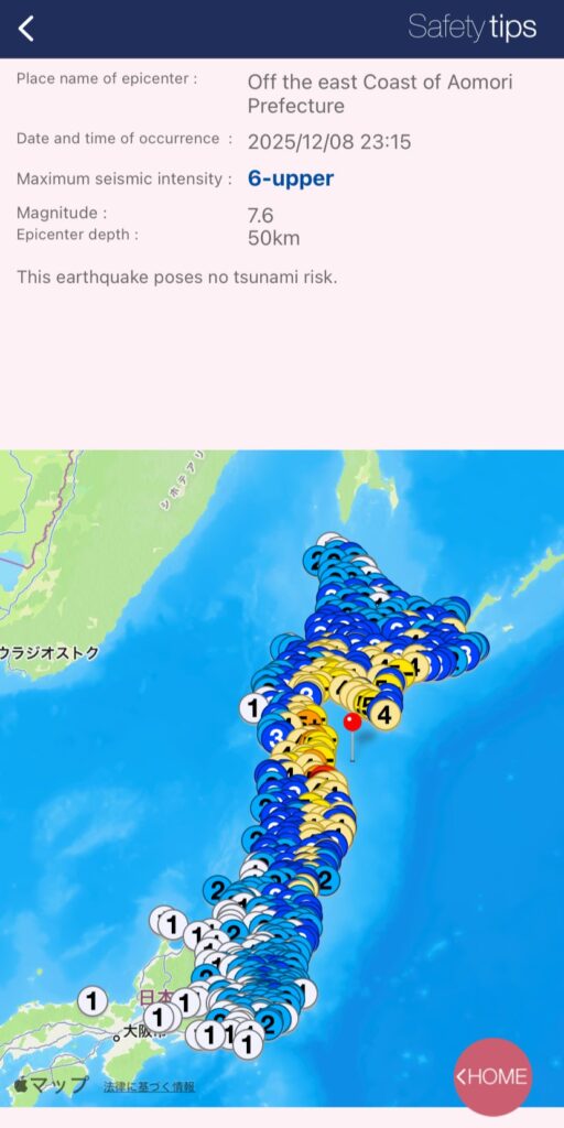 以下のスクリーンショットは、実際にSafety tipsが表示する地震情報・津波警報の画面です。英語など15言語で震源地・震度・マグニチュードが一目でわかる設計になっています。
